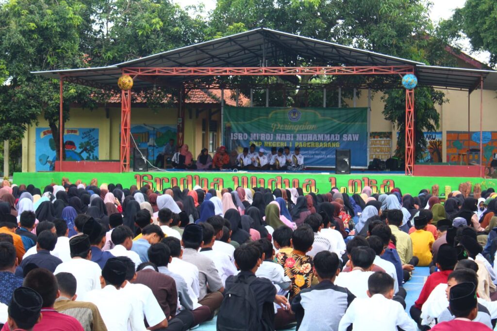 OSIS SMPN 1 Pagerbarang mengadakan kegiatan memperingati Isro’ Mi’roj Nabi Muhammad SAW pada Jum’at, 26 Rajab 1444 H. Dalam sambutannya, ketua OSIS Wulan Sekartaji mengucapkan terima kasih kepada teman-teman dan juga Bp/ibu guru yang telah membantu dari persiapan sampai pelaksanaan kegiatan Isro’ Mi’roj.
