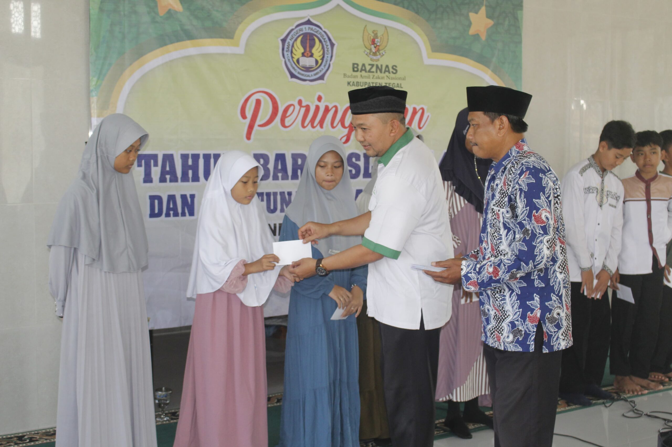 Acara di lapangan selesai, berlanjut ke Mesjid Nurul Iman SMP Negeri 1 Pagerbarang untuk acara Santunan Anak Yatim Piatu bersama Baznas yang dihadiri oleh bapak/ibu guru beserta staf TAS. Sebanyak 69 siswa mendapatkan santunan. Sumber dana didapatkan dari Baznas Kabupaten Tegal dan sumbangan dari bapak/ibu guru dan staf TAS SMP Negeri 1 Pagerbarang. Kegiatan ini bertujuan untuk memberi pengetahuan kepada para siswa tentang Tahun Baru Islam dan membiasakan warga sekolah rajin berbagi dan beramal.